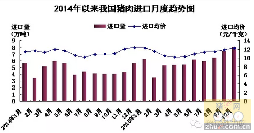 据海关统计,今年1-10月,我国进口猪肉59.9万吨,比去年同期(下同)增加29.3%;价值68亿元人民币,增长30.7%;进口均价为每千克11.4元,上涨1.1%。其中,10月份进口8万吨,增加97.4%;价值9.9亿元,增长1.2倍;进口均价为每千克12.3元,上涨10.7%。