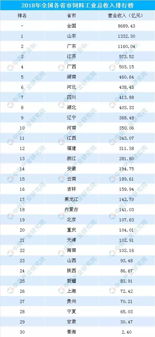 在全国各省市饲料工业总营业收入排行榜上,全国共有22省市收入规模超过100亿元,300亿元以上的有12省市,4省市收入规模在500亿元以上,其中山东和广东全年饲料工业总收入超过1000亿元,居全国第一二位。2018年江苏省饲料工业实现总收入573.52亿元,排名第三位。广西饲料工业营业收入也在500亿元以上,全国排名第四位。湖南省以460.64亿元的收入规模位列全国第五。