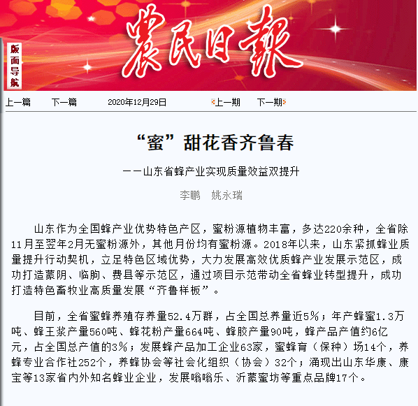 山东作为全国蜂产业优势特色产区,蜜粉源植物丰富,多达220余种,全省除11月至翌年2月无蜜粉源外,其他月份均有蜜粉源。2018年以来,山东紧抓蜂业质量提升行动契机,立足特色区域优势,大力发展高效优质蜂产业发展示范区,成功打造蒙阴、临朐、费县等示范区,通过项目示范带动全省蜂业转型提升,成功打造特色畜牧业高质量发展“齐鲁样板”。