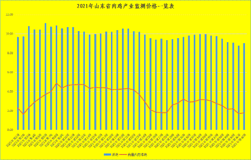 第42周,肉鸡和白条鸡价格回升,雏鸡价格回落后反弹。截至第42周末,活鸡价格为9.04元/公斤,同比升高7.49%,环比升高2.96%。其中最高地区潍坊安丘价格为16.00元/公斤,最低区域在临朐,为6.40元/公斤。