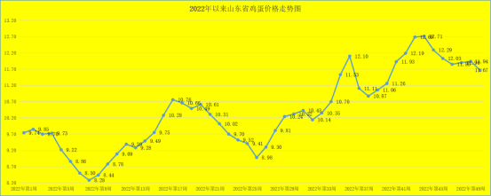 第50周,我省鸡蛋价格承压回落。本周,我省鸡蛋销售平均价格为11.67元/公斤,同比升高16.47%,环比降低2.26%。就全省监测的26个价格县来看,目前我省最高价为12.20元/公斤,最低价为10.80元/公斤。