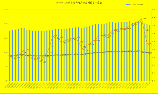肉雏鸡方面,进入年关休养期,加之近期寒潮提前来袭,养殖场将休养期提前,肉雏鸡价格持续下跌。第50周,我省肉雏鸡均价为2.23元/羽,同比升高10.95%,环比降低6.30%,其中章丘区出现最高价,为3.80元/羽;最低区域价格在莘县,为1.10元/羽。受停孵影响,本周有14个县无报价。按照2023春节规律,本年度停孵期在12月上旬,停孵期通常在10-30天,预计12月下旬停孵期结束,肉雏鸡市场将恢复正常交易。但需时间消化停孵期积攒的种蛋出雏量,因此在近一阶段肉雏鸡价格或继续呈现下跌走势(12月中下旬)。积攒量消化完毕后,肉雏鸡有望在供紧需增态势下得到提振。