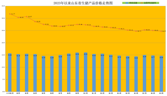 第19周(5月8日-5月14日),本周生猪及猪肉价格延续回落态势,整体走低。据对全省26个集贸市场价格定点监测,第19周全省肥猪出栏均价为14.64元/公斤,同比降低4.06%,环比回落0.88%。猪肉价格回落,本周猪肉均价为24.67元/公斤,同比降低8.73%,环比回落1.44%。