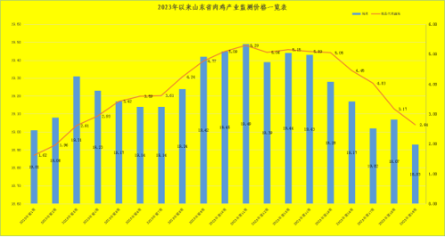 本周肉雏鸡供给增量叠加需求下降是导致商品代雏鸡价格下降的核心原因。当前商品代鸡苗出苗量逐渐增多,供给充足;同时4月中下旬开始毛鸡价格连续走低,对商品代鸡苗支撑力度不足。前期受雏鸡价格走高影响,强制换羽的父母代种鸡逐渐进入产蛋高峰期,且受高价刺激,行业延迟淘汰高龄种鸡增加了鸡苗产出量;另一方面在产父母代种鸡存栏一直处于上升趋势,据中国畜牧业协会禽业分会数据,截至2023年5月7日,在产父母代种鸡存栏2195万套,较年内低点增加16%;商品代苗销量8962万套,较年内低点增加40%。据东营市广饶县监测,当前毛鸡及鸡产品价格下降,市场疲软,养殖户补栏积极性不高,导致肉雏鸡价格下跌。