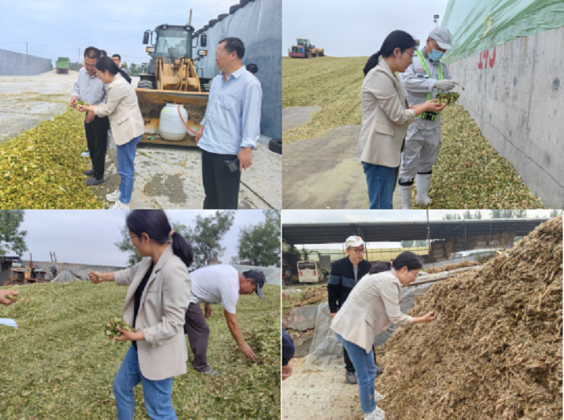 专家组到场调查今年青贮、粗饲料等收获期、数量、价格、收贮进度、质量控制等情况,查看袋装黄贮和蒜秸青贮实验,并结合历年优质青贮行动检测结果,指出牧场质量进一步把控的措施。