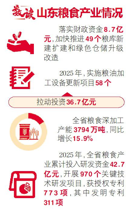 在加快建设更高水平“齐鲁粮仓”方面,2025年实施粮油加工设备更新项目58个,拉动投资36.7亿元;推动粮食初加工企业享受农业生产用电价格,减少企业用电支出,政策惠及粮食企业1139家,助力企业降本增效。目前,全省已形成十大粮食特色产业聚集区,培育出10家百亿级、64家20亿级、104家10亿级骨干企业,构建起“雁阵形”发展格局。推动产业链向纵深延展。全省粮食深加工产能3794万吨,同比增长15.9%。2025年,全省粮食产业累计投入研发资金42.7亿元,开展970个关键技术研发项目,获授权专利773项,其中发明专利311项。全国首个全链条粮食产业互联网平台“好粮有网”线上累计额突破150亿元。